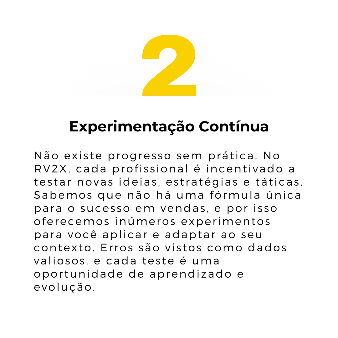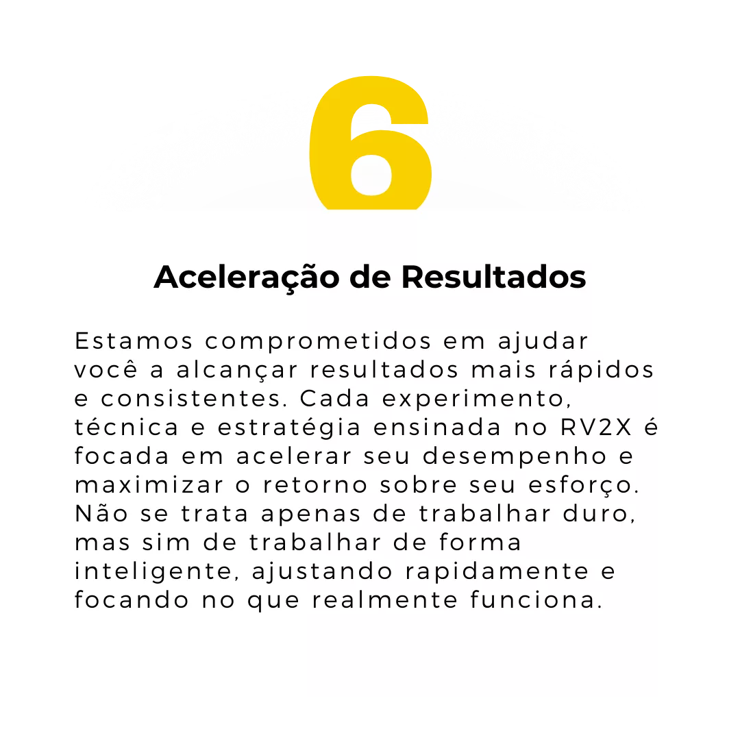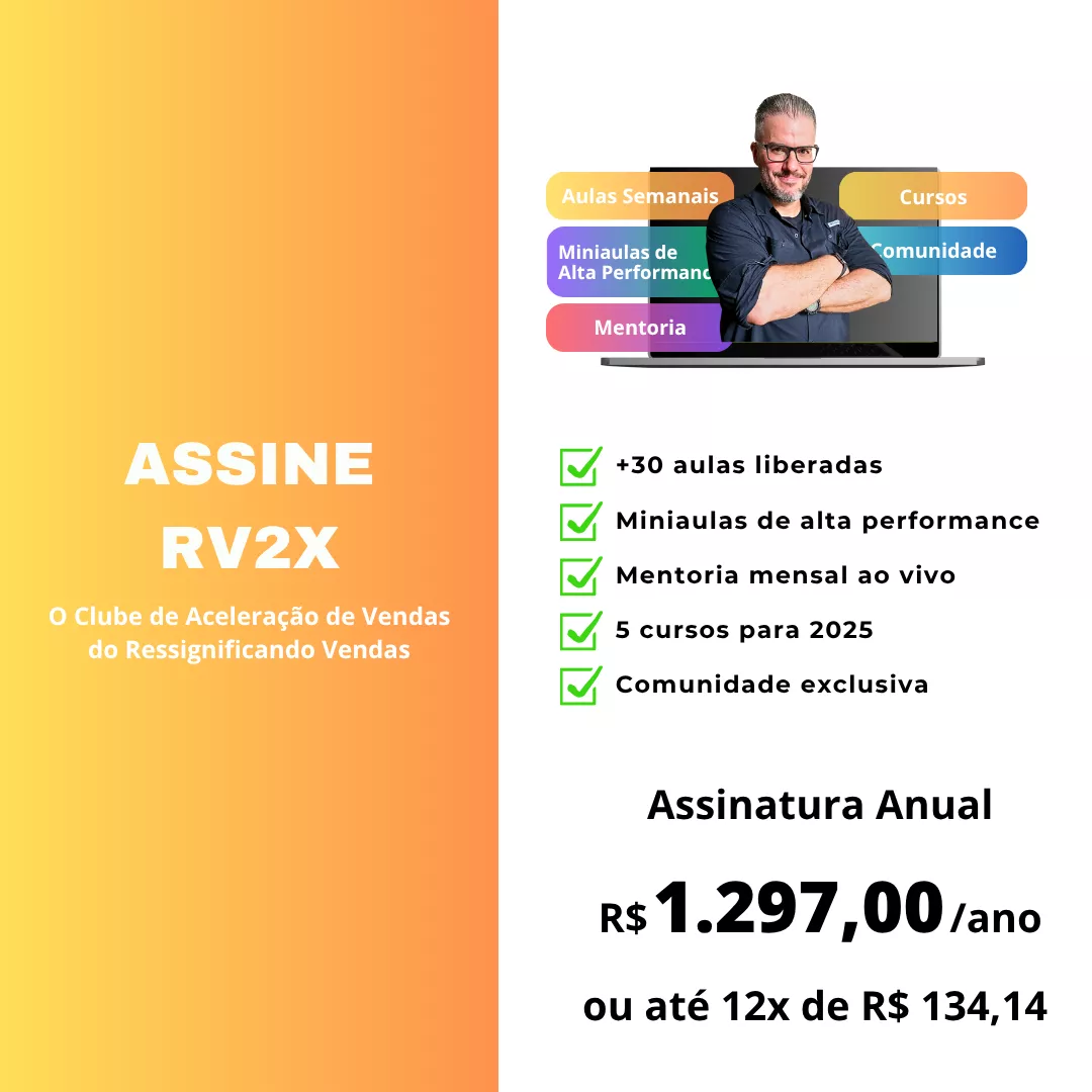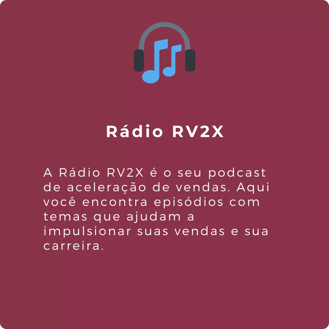 A proposta do RV2X é você aprender no seu ritmo, um pouco a cada semana. Você determina o que você precisa para o momento e encaixa na sua rotina. Todos os conteúdos são simples, curtos, objetivos e práticos, pensados para quem não pode desperdiçar nada do tempo precioso de vendas. É um espaço de aprendizado feito para você aprender rápido o que pode acelerar as suas vendas. E fala sério, se você aprender uma técnica e aumentar suas vendas com ela, você vai arranjar tempo para mais outra, não é mesmo?