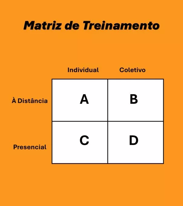 A Matriz de Treinamento é uma ferramenta prática e estratégica que organiza os momentos de treinamento da equipe de vendas, equilibrando interações individuais e coletivas, realizadas de forma presencial ou à distância.