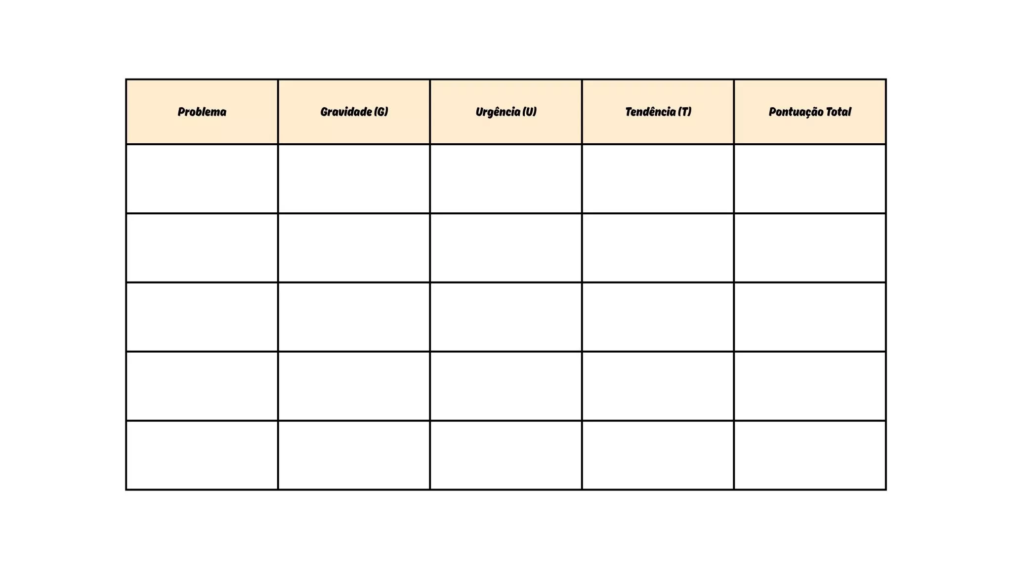 - Tendência (T): O problema tende a piorar com o tempo? Vai se agravar se não for tratado logo?
